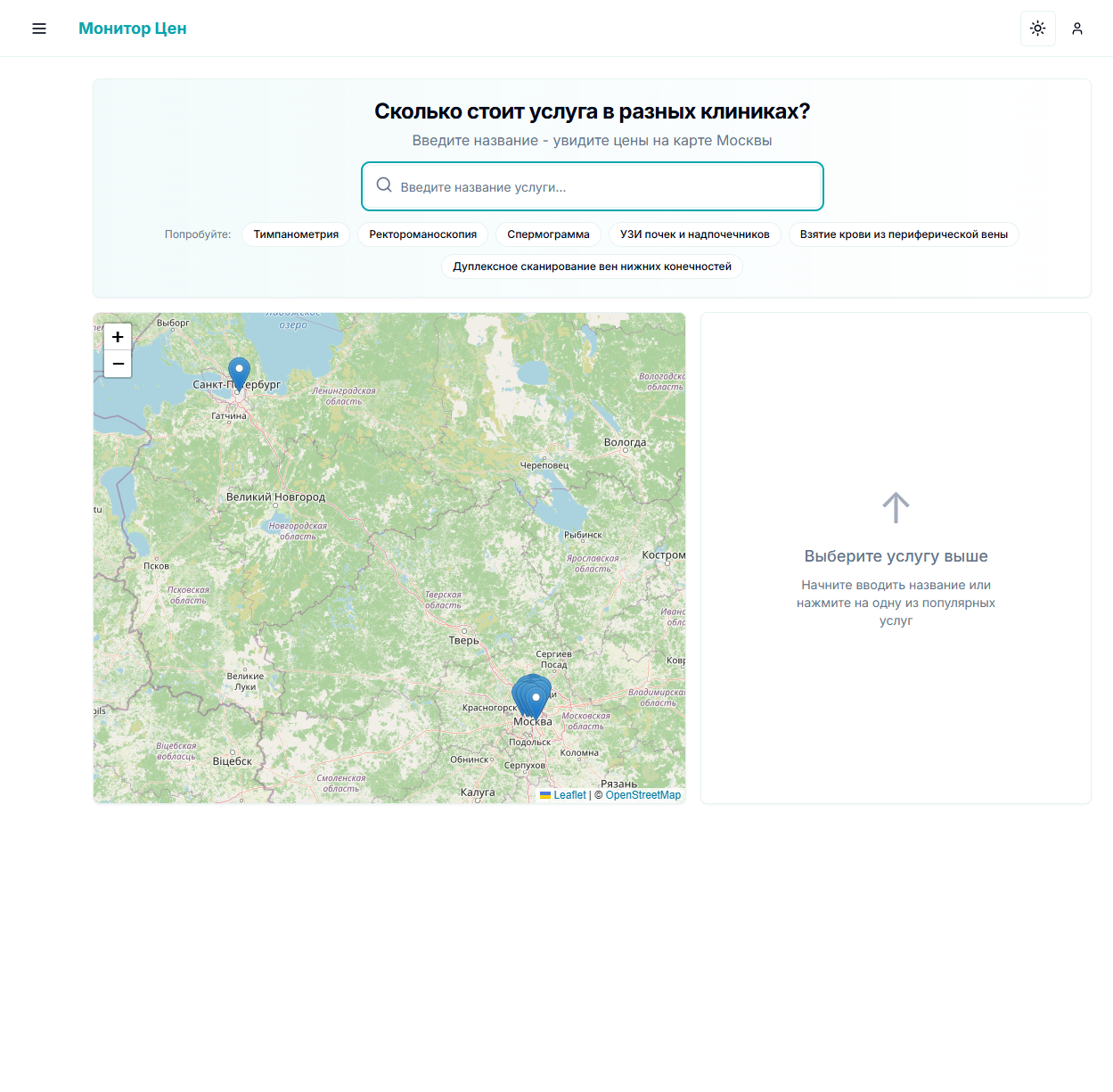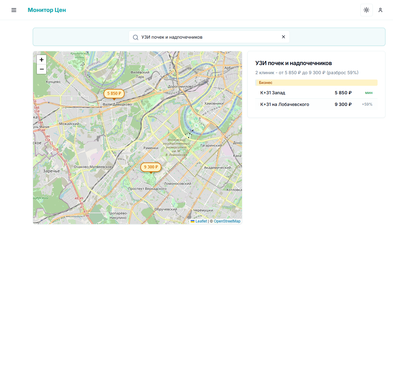 После маппинга на единую номенклатуру можно мгновенно сравнить стоимость медицинских услуг во всех клиниках. Вводите название - видите цены на карте Москвы.